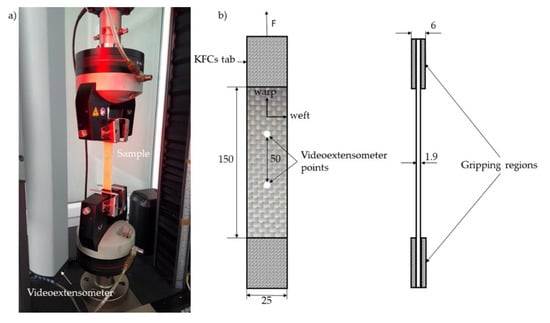 Plate specimens (250 mm × 25 mm × 1.9 mm) were employed for the tension test. As shown in Figure 2, an Instron 5967 machine equipped with a videoextensometer was used to perform the tensile tests according to PN-EN ISO 527-4:2000 [35]. All specimens were tested at a speed of 2 mm/min.