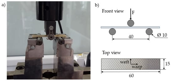 The bending tests were performed according to PN-EN ISO 14125:2001 [36], using the same tensile machine equipped with a three-point bending rig. The vertical displacement speed of the rig was 1 mm/min during the test. The specimens were 60 mm long, 15 mm wide, and 1.9 mm thick, and the span was 40 mm, as shown in Figure 3.