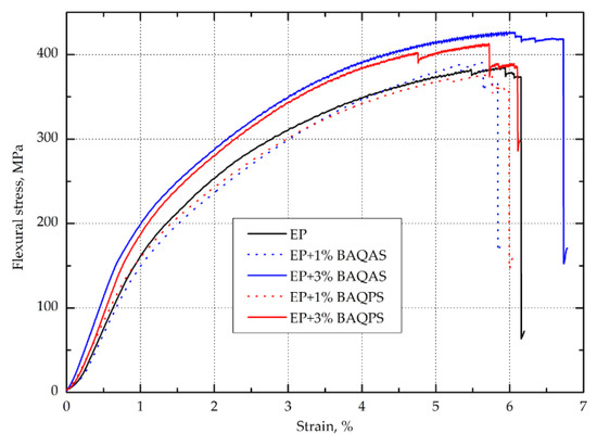 The results, i.e., arithmetic means from ten tests of flexural strength for each aramid fabric--reinforced epoxy composites with modified bentonites are collected in Table 2. Figure 6 show the tensile stress-strain relationship of Kevlar-reinforced composites. As in the case of the curves obtained during the tensile test, the curves presented in Figure 6 show differences in the performance compared to the relationships presented in other papers [11,38,43]. This time they concern the final part of the bending stress vs. deformation curves. Namely, our composites do not show high values of yield displacement and are characterized by failure in brittle manner, regardless of the type of matrix used. The results presented in Table 2. indicate that the addition of 1% wt. of modified bentonites to epoxy matrices did not significantly affect the bending stress and elastic modulus of laminates. This could be related to the fact that the longitudinal flexural strength is determined by the fiber properties. During the bending of continuous fiber reinforced composites, the composite is compressed and tensioned. Polymer composites, in particular aramid fiber composites, are characterized by the weak transverse properties [44,45] and significantly lower compression compared to tension strength [46]. As a result, the bending strength depends primarily on the compressive strength, as the damage usually starts on the compressive side [30]. In turn, scientific studies indicate that the addition of 1 wt.% of organoclay does not significantly affect the change in compression properties of epoxy nanocomposites [47,48,49,50]. As a result, the obtained composites with 1 wt.% of organoclay characterized by the bending properties at the level of unfilled composite. This is also visible in Figure 6, as the curves are similar to EP/Kevlar sample, with maximum stress, elastic and plastic limit and failure manner. In turn, the addition of 3 wt.% bentonite causes a slight change in failure manner, with highest yield displacement and maximum load. Furthermore, the slope of the curve is greater, which indicates greater rigidity. As a result of composites containing 3 wt.% modified BA, slight increases in the ultimate flexural strength and elastic modulus were observed.