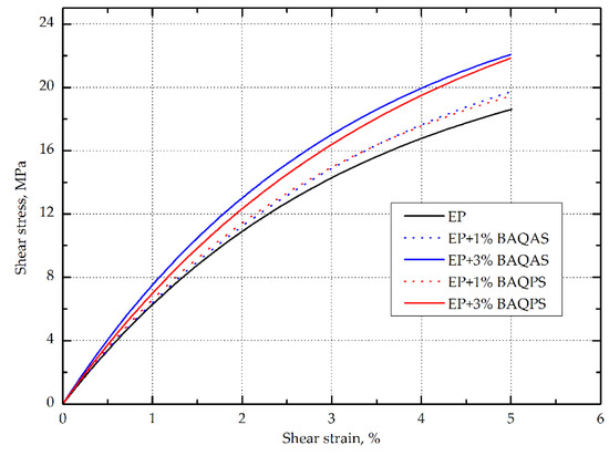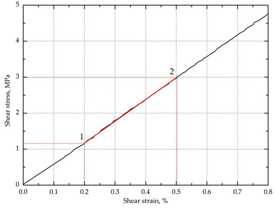 The shear modulus of the composites was determined from the shear strain curve for the shear strain range of 0.002–0.005, using the Equation (2) as per PN-EN ISO 14129:2000: