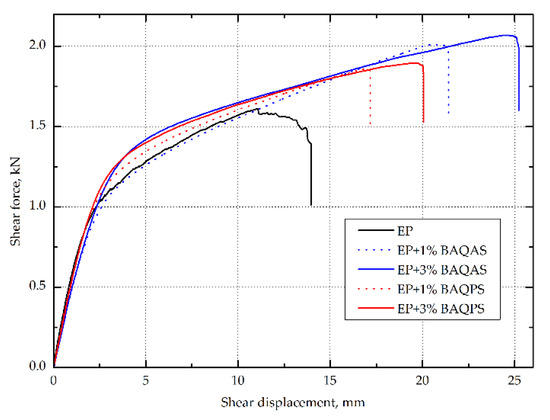 The influence of the content of modified layered aluminosilicates in the epoxy matrix on the shear stress-shear displacement was even more visible after exceeding 0.05 for the shear strain value (shown in Figure 8). As a result, the maximum shear stresses of composites containing 1 and 3 wt.% BAQAS increased by 31.8% and 48.9%, respectively, compared to the unmodified composite. In turn, for laminates with 1 and 3 wt.% BAQPS content, improvements of the maximum shear strength by 20.6% and 26.2% were achieved compared to the reference sample, respectively. This improvement is attributed to the dispersion of clay in the matrix and the change in its properties, as the properties obtained under ±45 off-axis tension were dominated by the matrix properties and interface interaction [9,57]. On the recorded in-plane shear load–displacement curves of the composites, the slope of the curve decreased as the shear load increased, which indicates a reduction in the matrix stiffness due to local cracks (Figure 8) [58].