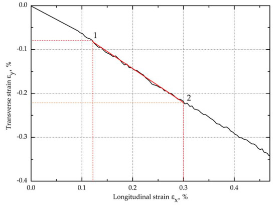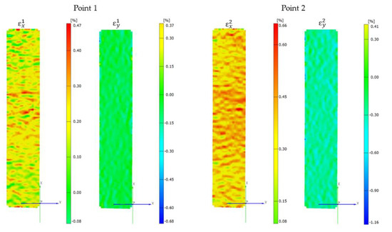 The longitudinal εx and transverse εy normal strain values obtained from the analysis of images recorded during the study were used to calculate the shear strain (Figure 9). Examples of diagrams of longitudinal and transverse deformation fields for points 1 and 2 are shown in Figure 10. Then, on the basis of the data from the points 1 and 2 marked in Figure 11, the in-plane shear modulus from the shear stress–strain curve at the proportional limit was determined.