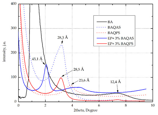 This effect is also compounded due to a perceived shielding effect of the long alkyl chains, which affects the binding energy of the anionic components. As a consequence, quaternary ammonium salts penetrate better into galleries of aluminosilicates. This was confirmed by the curves recorded for composites EP containing 3 wt.% modified aluminosilicates, whose maximum peaks were shifted toward the lower diffraction angles. Among these composites, a much larger intergallery spacing, above 35 Å, was observed for the samples containing BAQAS. On the other hand, EP+3%BAQPS had a much smaller distance between the layers of 22 Å. Such a large difference may result from the presence of aromatic rings in the structure of phosphonic salt, which hinders the migration of epoxy resin chains to the inter-package spaces. Such a large difference is the effect of the smaller d-spacing of BAQPS plates in comparison to BAQAS, which makes the migration of polymer chains between clay packages more difficult.