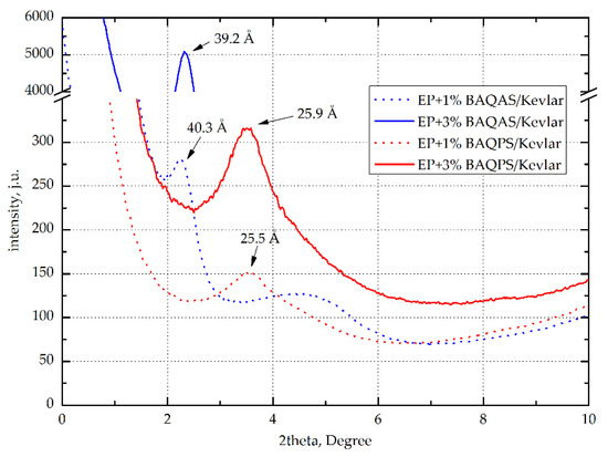 In the case of aramid fiber composites, the d-spacing of modified clays were lower than those for non-reinforced composites (Figure 13). This applies to materials with matrices containing 3 wt.% BAQAS and BAQPS, for which d001 were lower by approximately 5.9 Å and 2.6 Å, respectively. This may be due to the limited mobility of the clay platelets due to the presence of fabric. In addition, external pressure increased this effect, which contributed to the orientation of the clay platelets [64]. Differences may be due to the lower fiber content of the composite and the use of fabrics instead of mats. Lower fiber contents result in longer distances between the layers, which facilitates any arrangement of the clay platelets [65].