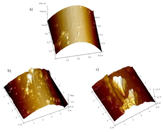 Atomic Force Microscopy (AFM) topography of a fiber pulled out after brittle fracture of the composites with matrices: EP (a), EP+3%BAQAS (b), EP+3%BAQPS (c).
