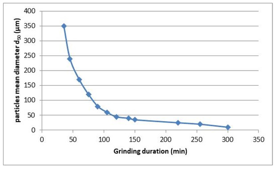 The residues from the optical classification were ground using a bar mill equipped with 15 bars of three different diameters. During grinding, in different time intervals, samples were taken to test the kinetics of the process (Figure 2). The quantities extracted were small enough so that they did not affect the behavior of the mill but large enough so the results obtained in the laser granulometry tests were representative of the kinetics. Then, the same weight of waste (20 ± 0.01 kg) was introduced in each milling test to reproduce the same working conditions, and the granulometry of the glass powder obtained was checked and represented as a function of the operating time of the mill.