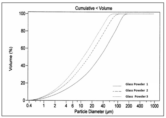 Distribution of the accumulated granulometry of the three batches of glass powder.