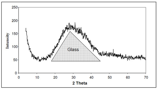Glass subjected to X-ray diffraction tests (Figure 5) results in a wide diffraction band between 15 and 45 degrees, which corresponds to its amorphous and disordered structure.