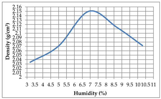 In the results obtained for the modified proctor, it can be seen that the maximum density of compaction was 2.15 g/cm3 with an optimum humidity of 7%. These results show a notable improvement in terms of density compared to soils treated with conventional cements [27].