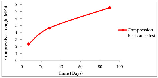At the age of seven days, a compressive strength of 2.38 MPa was obtained. The resistance to compression at the age of 28 days is almost double than that obtained at seven days (an increase of 94%), and that obtained at 90 days is more than three times that corresponding to seven days. This value meets the specifications established for a stabilized soil S-EST 3 (minimum of 1.5 MPa) and for a cement floor, considering the pozzolanic binder manufactured with powder micronized glass, as a special cement (values included in the interval 2.13–3.83 MPa). Resistances obtained at 90 days were of the same order of magnitude as those that generally have a soil–cement built with soils of adequate quality [45]. The results obtained in the compressive strength test indicate that this material is suitable for the purpose studied.