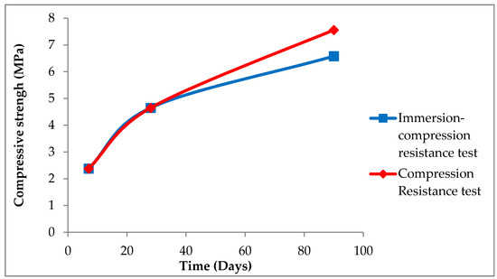 As can be seen in Figure 9, after the immersion test, only a 23% loss of resistance was observed with respect to that seen in the same period of time (90 days) for specimens that were not subjected to the immersion test. That is, the resistance was 87% of the initial resistance, which can be considered high [45].