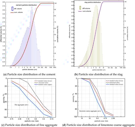 The chemical compositions of cement and slag used are shown in Table 2. The particle size distribution of them are shown in Figure 1a,b. The particle size distributions of fine aggregate (natural sand) and coarse aggregate (limestone) are shown in Figure 1c,d, respectively. The standard polycarboxylates high-performance water-reducer (Superplasticizer) is used. With the 1.0–2.0% superplasticizer, the water content was reduced by 20–30% while the concrete became SCC, the slump maintained, strength increased, shrinkage decreased, and environmental protection was achieved.