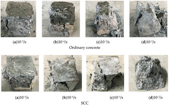 From the failure pattern of concrete, the influence of loading strain rates on the mechanical properties of concrete can be identified. Figure 3 displays the failure patterns of ordinary concrete and SCC at different loading strain rates.