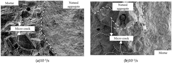 Further, SEM was used to analyze the pattern of SCC between the coarse aggregate and mortar gelling layer after compression failure under two different loading strain rates. Figure 4 shows the microscopic failure pattern.
