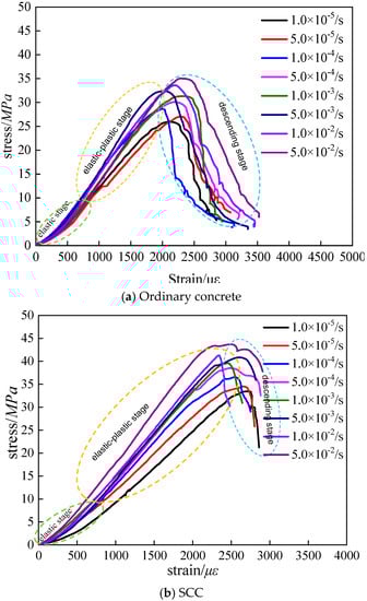 Based on the compression test for the ordinary concrete and SCC, the average value was calculated as the maximum strength, which did not meet, then the test was carried out again until the requirements were met [32]. In this study, 30 ordinary concrete specimens for eight different strain rates were tested, among which, one repeated test was conducted because the test result did not meet for the strain rate of 5 × 10−3/s and 5 × 10−2/s, and 27 SCC specimens were tested, including a repeated test for the strain rate of 1 × 10−2/s. Each stress–strain curve was plotted by the average value of three replicates. According to test data processing and analysis, the deviation of maximum strength of ordinary concrete and SCC for each strain rate is 0.8~1.3 and 0.7~1.4, respectively. Stress–strain curves of ordinary concrete and SCC with eight different loading strain rates were obtained. By analyzing the stress–strain curves of the two kinds of concrete, relevant mechanical properties can be revealed, shown in Figure 5. Meanwhile, the stress–strain curve also serves as an essential basis for analyzing other mechanical properties. Figure 5 presents the stress–strain curves of ordinary concrete and SCC. It is noted that the ordinate y represents the strength value of ordinary concrete or SCC, and the coordinate x represents the engineering strain value ε in Figure 5. The so-called engineering strain is relative to the true strain εt. Engineering strain is defined as the elongation ∆l within the range of gauge length divided by the initial value l0 of the gauge length, written as ε = ∆l/l0. In the process of calculating real strain value, usually, the whole stretching stage is divided into countless tiny segments. for any segment, the instantaneous length of the specimen is l, the elongation of the specimen is dl, the change of the true strain is dεt = dl/l, the true strain of the specimen stretching from l0 to l can be regarded as the cumulative value of infinitely many true strain increments, and the equation is written as εt = .
