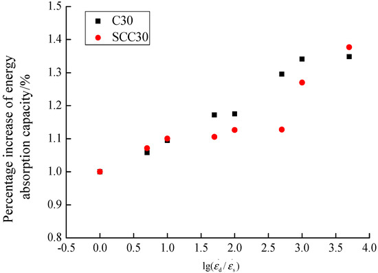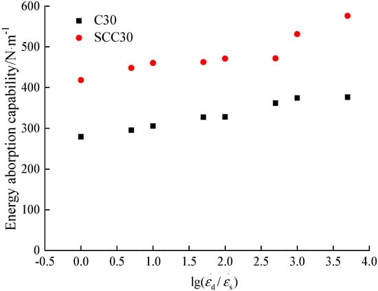 The energy absorption capacity of concrete is generally considered as the energy required from initial loading to failure of the specimen [14]. According to the stress–strain curves of ordinary concrete and SCC under different loading conditions, the influence of different loading strain rates on concrete energy absorption capacity is calculated, as shown in Figure 6 and Figure 7.