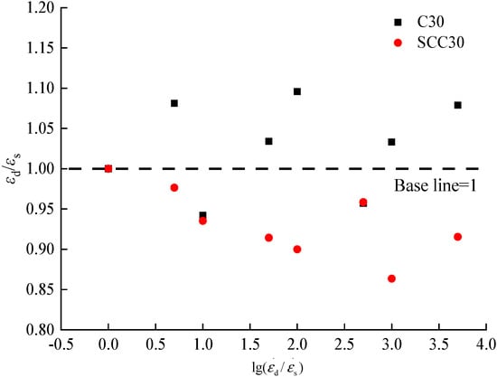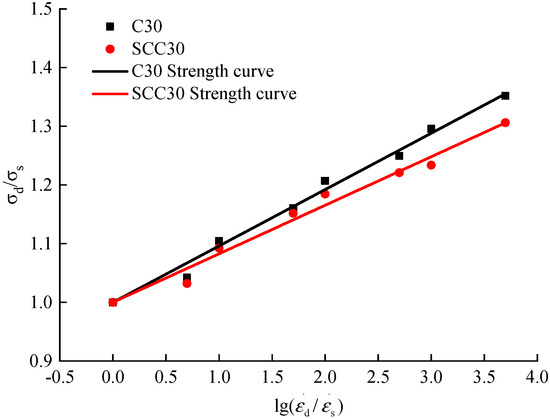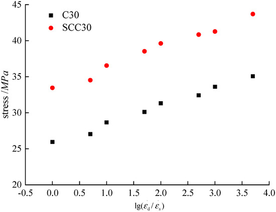 In order to further quantitatively analyze the influence of loading strain rate on peak compressive stress of ordinary concrete and SCC, a dimensionless dynamic increase coefficient was established by taking the logarithm of the dynamic strain rate and static strain rate [34]. The dimensionless dynamic increase coefficient can be expressed as follows: