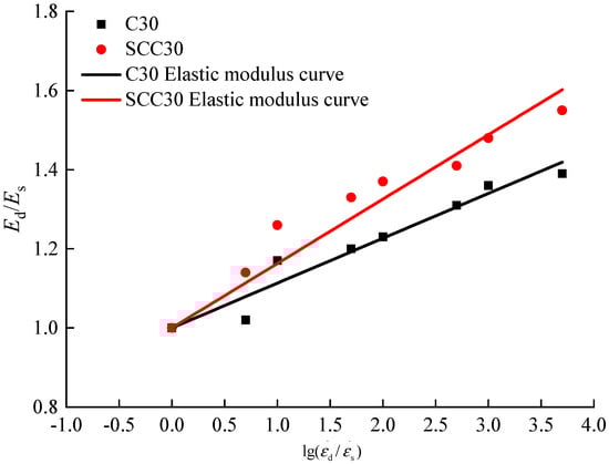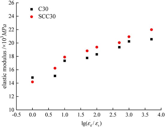 The same quantitative analysis method as the peak stress was used to analyze the variation of the elastic modulus of ordinary concrete and SCC under the influence of loading strain rate, and the relation equation for the increase coefficient of elastic modulus of concrete and the loading strain rate was established, as shown in Formula (6).