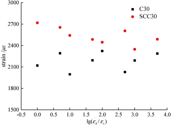 According to Figure 12 and Figure 13, the peak compressive strains of ordinary concrete and SCC at different loading strain rates are in the ranges of 1997 με-2323 με and 2347 με-2718 με, respectively. The peak compressive strain rate of SCC is higher than that of ordinary concrete. The peak compressive strain rate of ordinary concrete under loading strain rate of 1.0 × 10−5–5.0 × 10−2 is -5.80–+9.58%, while that of SCC is −13.65–0%. With the increase of loading strain rate, the variation of the peak compressive strains is discrete without a clear pattern, while the peak strain of SCC decreases gradually with the increase of loading strain rate, which can be ascribed to the randomness and rate-dependent coupling effect of concrete, resulting in the discrete variation of peak strain.