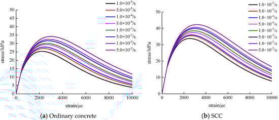 According to the analysis of Figure 5, the development of stress–strain curves of ordinary concrete and SCC shows good continuity and smoothness at different loading strain rates, and the loading strain rate does not influence the continuity and smoothness of the concrete stress–strain curve. The stress–strain curves of ordinary concrete and SCC under different loading strain rates are divided into three phases: elastic stage, elastic–plastic stage, and descending stage. Besides, from Figure 5, it can also be observed that the peak compressive stress and dissipation energy gradually increase with the increase of loading strain rate. Compared with the stress–strain curve of ordinary concrete, the brittleness of SCC is obvious.
