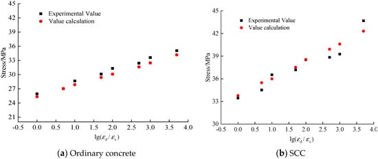 According to the elastic modulus of ordinary concrete and SCC with different loading strain rates in this paper, mathematical regression analysis was carried out by using Formula (6), and the relationship between the increase coefficient of elastic modulus of the two kinds of concrete and the loading strain rate was obtained, as shown in Figure 7 and Formulas (7) and (8).
