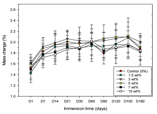 The highest mass change was observed for the control group and the lowest for the group containing 10 wt.% zirconia for all of the test durations. This could be related to the fact that the addition of zirconia fills the empty spaces in the PMMA resin and reduces sorption of saliva or mass change compared to the control group. Alsharif et al., who studied the effect of different ratios of filler loading on saliva sorption and solubility in resin composite, found that samples with higher filler loadings showed the lowest change in mass when compared to the unfilled resin. They explained this as a result of filler loading [30]. In the current study, the changing of mass during long-term storage may be related to the release of residual monomer which is, at the same time, replaced with storage solution, leading to an increased sorption, particularly with the control group. However, the inclusion of ZrO2 might reduce the amount of residual monomer in the nanocomposite composition, evidenced by less sorption in comparison to the control group.