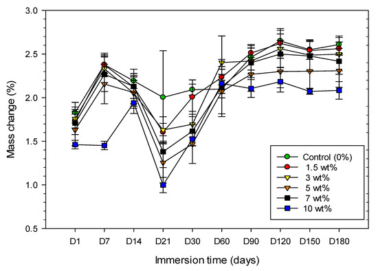 Line graph illustrating the mass change of specimens from six groups immersed in distilled water over 180 days.