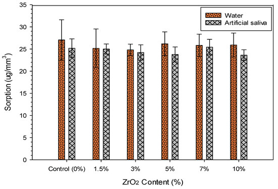 Ergun et al. investigated the effect of reinforcing conventional heat-cured PMMA with concentration of (5 wt.%, 10 wt.% and 20 wt.%) zirconia nanoparticles on water sorption and solubility after 28 days [31]. The findings showed that an increase in ZrO2 concentration increased water sorption. This was explained by the weak polymer chains allowing water to permeate into the matrix and the increase in the nanoparticle filler concentration resulting in more nanoparticles at the filler–matrix interface [31]. Kundie et al. evaluated the effect of different ratios of nano- and micro-alumina fillers on water sorption and solubility in denture base acrylic resin after 7 days. The reinforced samples showed slightly higher water sorption than the control group. The reason was attributed to the filler particle size and distribution and interfacial bond between the filler and the resin matrix [32]. Al-mulla et al. investigated the effect of HI acrylic resin, conventional heat-cured acrylic resin and other types of resin on sorption over 28 days storage in two types of artificial saliva and distilled water. They found that the HI resin had slightly less sorption in distilled water than that in artificial saliva, but not significantly. Whereas in conventional resin, sorption in distilled water was higher than that in the artificial saliva [27]. The findings of these previous studies contradict with the results obtained in the present study, in which all groups containing (1.5, 3, 5, 7, 10 wt.%) zirconia exhibited lower sorption values compared to the control group in both storage media.