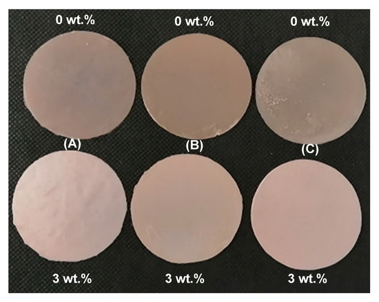 Photograph showing the colour changes in the control group (0 wt.%) and group containing 3 wt.% of ZrO2 (A) before immersion in distilled water (DW) or artificial saliva (AS), (B) after immersing for 180 days in DW and (C) after immersing for 180 days in AS.