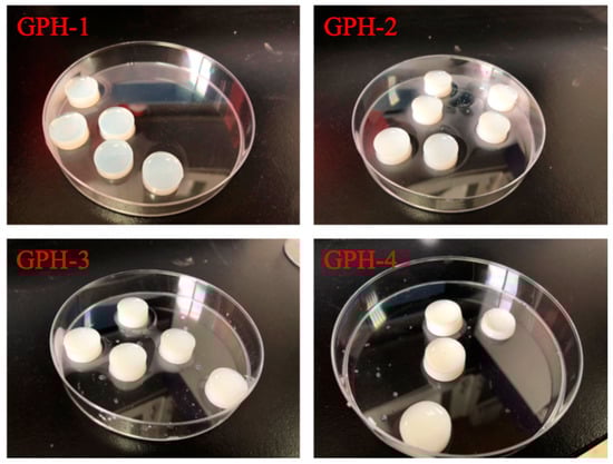 Four different GelMA-PEGDA-nHA composite hydrogels were prepared according to the composition ratios in Table 1, as shown in Figure 1. As the content of nHA increases, the color of the composite hydrogel gradually changes from transparent to milky white.