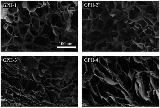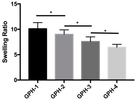 As shown in Figure 6, the swelling ratio of GPH-1 was 10.09 ± 1.23, GPH-2 was 9.01 ± 0.88, GPH-3 was 7.58 ± 0.92, and GPH-4 was 6.45 ± 0.58. According to our previous research [29], the swelling rate of GP hydrogel with the same composition without nHA is 9.11 ± 0.14, compared with GPH-1, there is no significant difference. With the increase of the content of nHA in the composite hydrogel, the swelling ratio decreased significantly (p < 0.05). On the one hand, the added nHA itself has no swelling effect, resulting in a decrease in the overall swelling ratio. On the other hand, the addition of nHA causes the porosity of the hydrogel to decrease, and the water retention capacity to decrease, resulting in a decrease in the swelling rate. Moreover, the increase in nHA content enhances the effect between Ca2+ and GelMA-PEGDA hydrogel, thereby increasing the rigidity of the hydrogel, which makes the hydrogel difficult to swell and deforms to absorb more water.