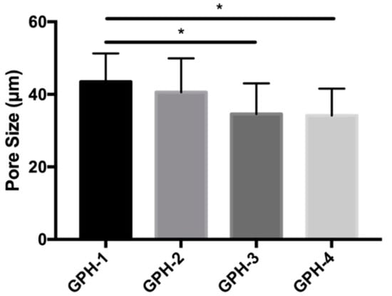 The pore size change of the GelMA-PEGDA-nHA composite hydrogel was counted by the Image J software, as shown in Figure 4. The pore diameters of GPH-1, GPH-2, GPH-3, and GPH-4 were 43.45 ± 7.45, 40.59 ± 9.36, 34.59 ± 8.45, and 34.17 ± 7.43 μm, respectively. With the increase of nHA content, the pore size of the composite hydrogel showed a downward trend, and the composite hydrogel with 2% and 5% of nHA was significantly decreased compared with the composite hydrogel with 0.1% of nHA (p < 0.05). The thickness of the pore wall of the statistical composite hydrogel did not change significantly with the increase of the nHA content.