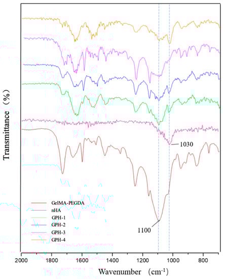 Infrared spectroscopy was performed on nHA, GelMA-PEGDA hydrogel, and GelMA-PEGDA-nHA hydrogel, respectively, as shown in Figure 5. In the infrared spectrum of nHA, the stretching vibration peak of the phosphoric acid group P-O in hydroxyapatite was at 1030 cm−1. With the increase of nHA content in the ternary composite hydrogel, the characteristic absorption peak at 1030 cm−1 gradually increased. At the same time, we observed that the C-O stretching vibration peak 1100 cm−1 of the strong hydroxyl group in the GelMA-PEGDA hydrogel gradually weakened or disappeared in the GelMA-PEGDA-nHA ternary composite hydrogel as the content of nHA increased. This phenomenon may be due to the interaction of more and more Ca2+ ions with the -OH in the hydrogel as the nHA content increases. Based on these results, it can be inferred that nHA interacts with GelMA-PEGDA through hydrogen bonding to form a bridge structure of [HO]–Ca2+–[OH] [31], which enhances the mechanical properties and stability of the material to some extent.