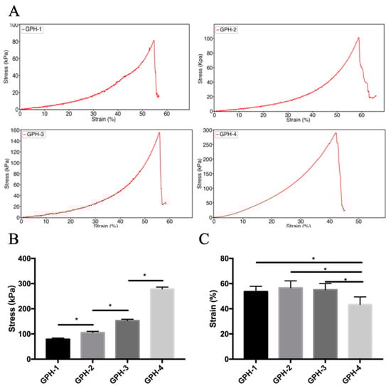 (A) Compressive stress-strain curve of GelMA-PEGDA-nHA composite hydrogel; (B) maximum compressive stress statistics; (C) maximum compressive strain statistics. (* p < 0.05).