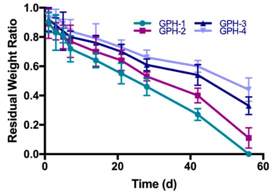 The degradation of GelMA-PEGDA-nHA composite hydrogel in type I collagenase solution is shown in Figure 8. In our previous research [29], the residual rate of GelMA-PEGDA with the same composition on day 21 is 43.7% ± 3.2%. The residual rates of GPH-1, GPH-2, GPH-3, and GPH-4 on day 21 were 55.1% ± 7.2%, 64.3% ± 7.0%, 70.0% ± 5.1%, and 73.5% ± 5.6%, respectively. At 21 days, the residual rate of all GPH hydrogels containing nHA was significantly higher than that of GP hydrogels without nHA. GPH-1 completely degraded within eight weeks, while GPH-4 had an excess mass of more than 50% after eight weeks of in vitro degradation. In the case of the same GelMA and PEGDA content, increasing the content of nHA can significantly prolong the degradation time of the composite hydrogel. The degradation rate of GelMA-PEGDA-nHA was slower than the GelMA-PEGDA hydrogel previously reported. On the one hand, the degradation rate of nHA was slower than that of GelMA and PEGDA. On the other hand, Ca2+ in nHA can coordinate with the amide bond of gelatin [32], thereby increasing the stability of the composite hydrogel and prolonging the degradation time. The ratio of GelMA, PEGDA, and nHA in the composite hydrogel can be changed to control the degradation rate to meet the needs of different applications.