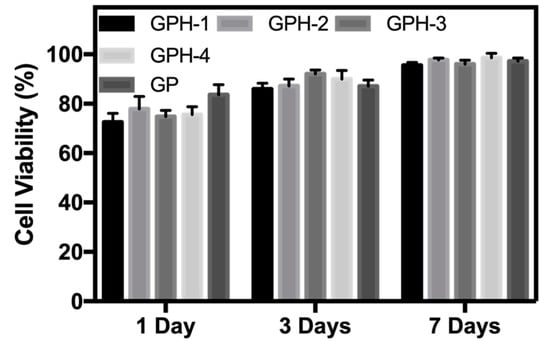 After one day of inoculation, MC3T3-E1 adhered well on the surface of the composite hydrogel with five different nHA contents. As can be seen from Figure 9, the MC3T3-E1 cells adhered to the surface of the hydrogel showed a long spindle shape. As the culture time increases, MC3T3-E1 cells can proliferate in all five hydrogel samples, and gradually grow over the surface of the hydrogels. Cell viability was calculated by counting the number of green viable cells and red dead cells in the live/dead staining map of ImageJ, 1, 3, and 7 d, as shown in Figure 10. After one day of inoculation, the cell viability of MC3T3-E1 on the surface of the four GPH composite hydrogel samples was more than 70% and cell viability on the GP hydrogel surface was 83.6% ± 4.1%, which was significantly increased (p < 0.05). This phenomenon may be due to the release of some unencapsulated nHA from the hydrogel at the beginning, which affects the cell viability. With the increase of culture time, the cell viability also increased. After three days, the cell viability was greater than 85% and there was no significant difference between the GP and GPH groups. After seven days, cell viability of all the hydrogel samples were greater than 95%. There was no statistically significant difference between the groups at the same culture time. Therefore, compared with the GP group, the four nHA contents used in this experiment had no significant effect on the cell viability of MC3T3-E1. GelMA-PEGDA-nHA composite hydrogel has good biocompatibility.
