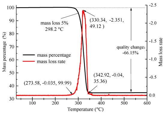 The construction temperature of the hot-mix asphalt mixture was relatively high. The PCTIA mixed into the mixture endured a very high temperature. For example, the mixing temperature of the hot-mix asphalt mixture is about 170–180 °C. If the PCTIA underwent serious mass loss under high-temperature conditions, the phase-change latent heat was insufficient, reducing the thermal-insulation effect. Therefore, a thermogravimetric analysis was performed to analyze the heat stability of the PCTIA. The thermogravimetric curve is presented in Figure 3.