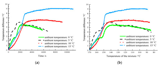 As shown in Figure 6a, the temperature difference increased over time in the period of 0–2500 s. After 2500 s, the temperature difference at 10 and 15 °C tended to be stable, whereas that at 0 and 5 °C tended to decrease. At the ambient temperature of 15 °C, the maximum temperature difference of the mixture was 9.1 °C, whereas it was 5.6 at 0 °C, indicating that the maximum temperature difference increased with the ambient temperature. This is because when the heat-transfer rate of the mixture decreased as the ambient temperature increased, the latent heat effect of the PCTIA became more obvious. When the temperature of the ordinary asphalt mixture reached 80 °C, the temperature difference between each value of ambient temperature was >4 °C, confirming that the effect of the PCTIA on the temperature was significant. As shown in Figure 6b, when the temperature of the AM-PCTIA at different environmental temperatures was >145 °C, the temperature difference between the two samples increased rapidly. At the ambient temperatures of 0, 5, 10, and 15 °C, the final temperatures in the rapidly increasing temperature difference section of the samples were 142, 143, 140, and 146 °C, respectively; thus, the temperatures were still in the phase-change temperature range in the exothermic stage.