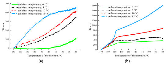 As shown in Figure 7, with an increase in the ambient temperature, it took longer for the two samples to decrease to the same temperature at the same position. This is because the total amount of phase-change latent heat in the asphalt mixture remained unchanged, and the release rate of the phase-change latent heat decreased with the increasing ambient temperature. The mixture at the edge exchanged heat with the external environment first, and the rate of heat loss was higher here than that at the center; thus, the thermal-insulation extension time at the edge was significantly lower than that at the center. To analyze the time difference between the two samples at the same temperature under different ambient temperatures more distinctly, temperatures of 160, 140, 120, 100, and 80 °C were selected. Then, the time differences corresponding to five temperatures between the AM-PCTIA and the ordinary asphalt mixture under different ambient temperatures were calculated. The results are presented in Table 3.