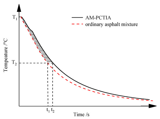 where f(T) represents the function of the temperature–time relationship curve for the AM-PCTIA, y(T) represents the function of the temperature–time relationship curve for the ordinary asphalt mixture; T represents the temperature (°C) of the asphalt mixture; T2 represents the initial temperature of the mixture; T1 represents the terminal temperature of the mixture; t represents the testing time (s); t1 represents the testing time of the ordinary asphalt mixture; t2 represents the testing time of the AM-PCTIA; and ΔTi and Δti represent the temperature and time differences of the two samples, respectively.
