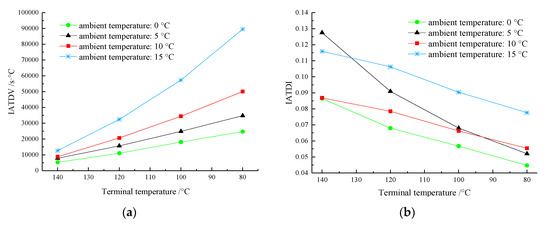 As shown in Figure 9a, in the cooling process of the asphalt mixture at different ambient temperatures, the IATDV increased gradually with a decrease in the terminal temperature. This is because the ordinary mixture was not mixed with the PCTIA; thus, the temperature dissipation was very fast. The temperature difference between the AM-PCTIA and the ordinary mixture increased gradually, leading to an increase of the integral. When the temperatures of the two samples of the asphalt mixture decreased to the same value, the IATDV increased with the ambient temperature. When the temperature of mixture decreased to 80 °C at an ambient temperature of 15 °C, the IATDV was 89,537.8 s·°C, which was 0.8 times higher than that at 10 °C. A higher ambient temperature corresponded to a stronger thermal-insulation ability of the PCTIA.