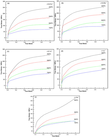 Above all, in the range of 400–700 °C, 0.01–10 s−1, during the compression experiment, strain hardening and dynamic recovery occurred simultaneously at lower temperature or higher strain rate. With dislocation proliferation, accretion, recombination, and annihilation, the dislocation distribution was observed first to be uneven and then gradually evolved into an independent cellular structure in different dislocation tangled areas [21]. This led to the formation of dislocation cells and reduction in dislocation density. Consequently, the stress–strain curve increased slowly at 400 °C (Figure 2a,b). At high deformation temperatures or low strain rates, the deformation process was accompanied by the formation and growth of recrystallized crystal nuclei, and the softening rate of the alloy appeared greater than or equal to the deformation hardening rate [23]. Thus, the stress–strain curve tended to stabilize (Figure 2a,b at 700 °C). At a deformation hardening rate equivalent to dynamic recovery and dynamic recrystallization rate, the stress–strain curve was stable (Figure 2a,b at 600 °C). The reason for the above-mentioned different laws can be attributed to the competition between dynamic hardening and dynamic softening phenomena.