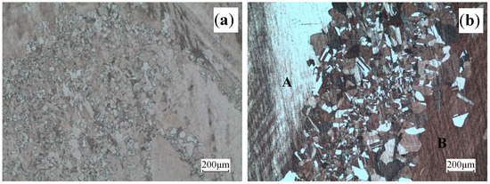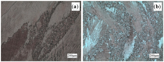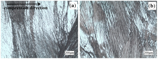 The microstructures of the deformed Cu–Sn–La alloy at 400 °C under different strain rates are illustrated in Figure 4. Due to the large initial grain size, macro coordinated deformation is difficult. The deformation of each grain appeared to be extremely uneven. Moreover, many slip bands and adiabatic shear bands were present in some grains [24], which were terminated at the grain boundary [25,26]. Under compression deformation, the grains rotated to become gradually perpendicular to the compression direction. Compared to Figure 4a, the slip bands in the grains became denser in Figure 4b as strain rate increased.