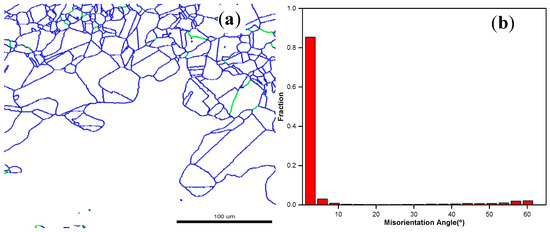 Figure 8a show the grain boundary map of the deformed alloy at 700 °C and 10 s−1, where the green frame is the recrystallized structures, and the blue frame represents the substructures and deformed structures. Figure 8b shows the misorientation distribution diagram of the deformed alloy at 700 °C and 10 s−1, where the fraction of misorientations below 3° was 85%, the fraction of misorientations ranging from 3 to 15° was 4%, and the fraction of misorientations over 15° was 10%. In the microstructure, when the misorientation was less than 3°, the grains were considered as a deformed structure; in the misorientation range (between 3° and 15°), the grains were regarded as substructures; when the misorientation exceeded 15°, the grains were considered as a recrystallized structure [28]. This result explains the shape change of the stress–strain curve (Figure 2)