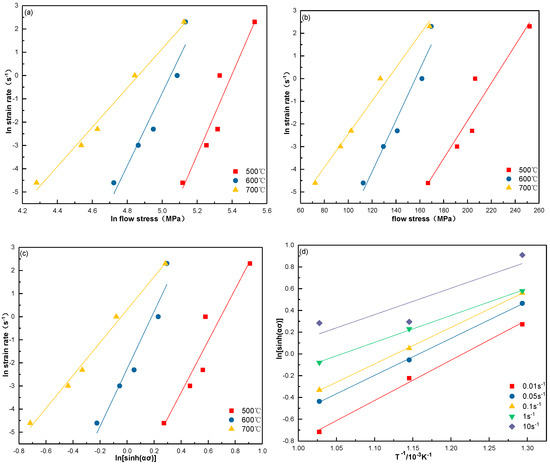Under hot processing conditions, constitutive equations are often used to calculate forces during processing at certain setting rates. The modeling of the processing stage must consider the uneven distribution of strain, strain rate, and temperature as well as their variations with time. The model may require several constitutive functions depending on the complexity of the flow curves [29]. The Arrhenius equation can be used to describe the constitutive relation of flow stress behavior during hot deformation. This type of constitutive relation is justified when strain hardening can be ignored. At 400 °C, the strain hardening effect is significant, in particular, in the case of high strain rate (10 s−1). At 500–600 ℃, the strain hardening effect is slight. Therefore, the calculation process of the constitutive equation was mainly carried out at 500, 600, and 700 °C.