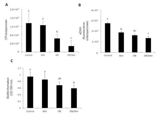 Evaluation of the antibacterial activity of melittin against E. faecalis biofilms. (A) Colony forming unit (CFU) counting. (B) eDNA measurement of E. faecalis biofilm. (C) Biofilm formation estimated spectrophotometrically using crystal violet staining. Values followed by the same superscripts are not significantly different (p > 0.05). Mel: melittin, DN: DNase, DN/Mel: DNase+melittin.