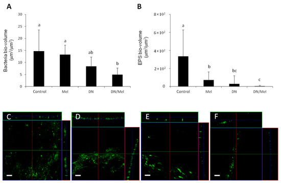 Determination of bio-volume of bacterial cells and extracellular polymeric substances (EPS) through confocal laser scanning microscopy (CLSM) analysis. (A) Bacteria bio-volume, (B) EPS bio-volume, and (C–F) representative CLSM images of E. faecalis biofilms grown on specimens. (C) Control (D) melittin, (E) DNase, and (F) DNase/melittin. Values followed by the same superscripts are not significantly different (p > 0.05). Mel: melittin, DN: DNase, DN/Mel: DNase+melittin. Scale bar = 100 µm.