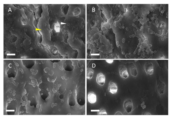 Representative field emission scanning electron microscope (FE-SEM) images of E. faecalis biofilms on specimens. E. faecalis was cultured in brain–heart infusion (BHI) for 7 days; (A) control, (B) melittin, (C) DNase, and (D) DNase/melittin. The yellow and white triangles indicate extracellular polymeric substance and bacteria, respectively. The magnification of the images was ×5000. Scale bar = 2 µm.