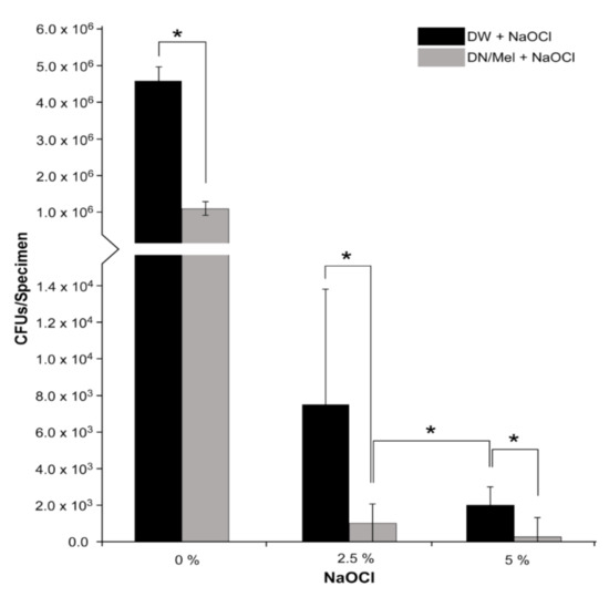 Synergistic effect of NaOCl with DNase and melittin (DN/Mel). Statistically significant p < 0.05 (*). DW: distilled water, DN: DNase, Mel: melittin, NaOCl: sodium hypochlorite.