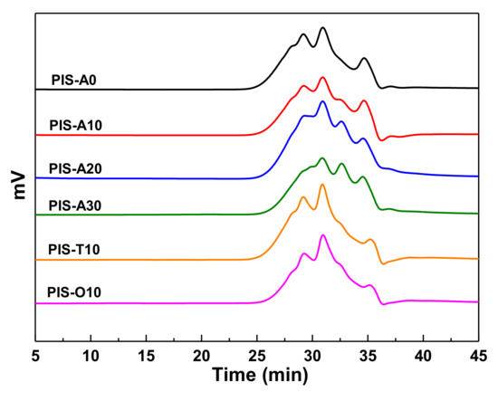 The GPC analyses were performed on the oligoimides to assess the Mn and the polydispersities (Mw/Mn), as shown in Figure 1 and the corresponding data were summarized in Table 1. The GPC curves showed that each oligoimide consisted of several elution time peaks between 25–37 min, implying the composition of several chemical species. The Mn values measured by GPC were slightly greater than the theroretical ones because of the polarity difference between measured samples and polystyrene standards [20]. The polydispersities of these oligoimides were in the range of 1.43–1.51. It is also found that PIS-A10, PIS-T10 and PIS-O10 mainly consist of three elution time peaks at 29, 31 and 35 min, respectively. However, these elution time peaks were detected at relatively longer elution time for the oligoimides with higher siloxane content, suggesting the existence of more low-molecular-weight species. It is interesting to note that the measured Mn of PIS-A oligoimides decreased with the increasing of siloxane content. For instance, PIS-A0 without APDS exhibited the measured Mn of 1687 g/mol, while the PIS-A30 with 30% of APDS molar fraction in diamines exhibited the measured Mn of 1356 g/mol. The number-average molecular weight difference ΔMn between the measured Mn and the calculated one gradually decreased with the increasing siloxane content in the order of PIS-A0 (323 g/mol) > PIS-A10 (172 g/mol) > PIS-A20 (79 g/mol) > PIS-A30 (12 g/mol). This is probably because of the relatively lower nucleophilic reactivity of APDS, which leads to the oligoimides with lower measured Mn.